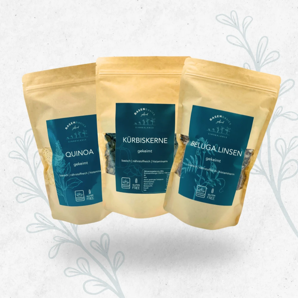 Das BASENkraft-Set ist die ideale Wahl für alle, die ihren Körper mit extra pflanzlicher Eiweißpower versorgen möchten. Quinoa, Belugalinsen und Kürbiskerne ergänzen sich perfekt: Sie liefern dir wertvolle Proteine, gesunde Fette, Ballaststoffe sowie eine Fülle an Vitaminen und Mineralstoffen. Dank des Keimprozesses sind die Zutaten nicht nur besonders nährstoffreich, sondern auch leichter verdaulich und bekömmlich. Ob in Bowls, Salaten, Suppen oder als Snack – mit diesem Set kannst du dich abwechslungsreich, pflanzlich und kraftvoll ernähren.